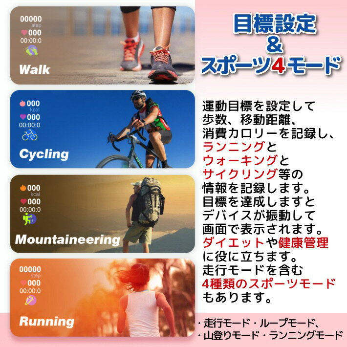 【目標設定&スポーツ4モード】運動目標を設定して歩数、移動距離、消費カロリーを記録し、ランニングとウォーキングとサイクリング等の情報を記録します。